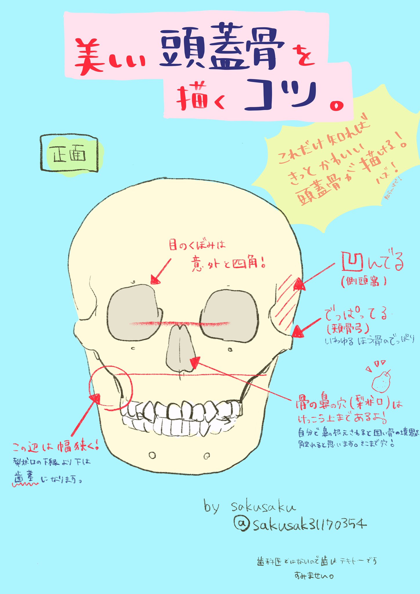 Sakusaku 美しい頭蓋骨を描くコツ 私の絵には頭蓋骨は一切出ませんが 仕事で頭蓋骨 をしょっちゅう描いていて それなりにこだわりもあるので 絵を描くにあたって必要な解剖だけ抜粋してまとめてみました 頭蓋骨構造よくわかんない バランスが